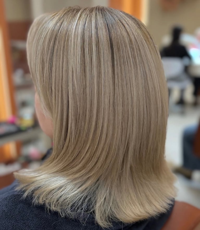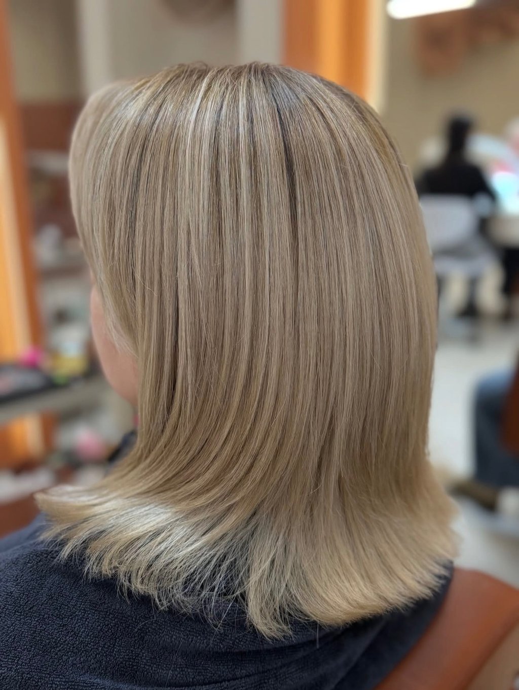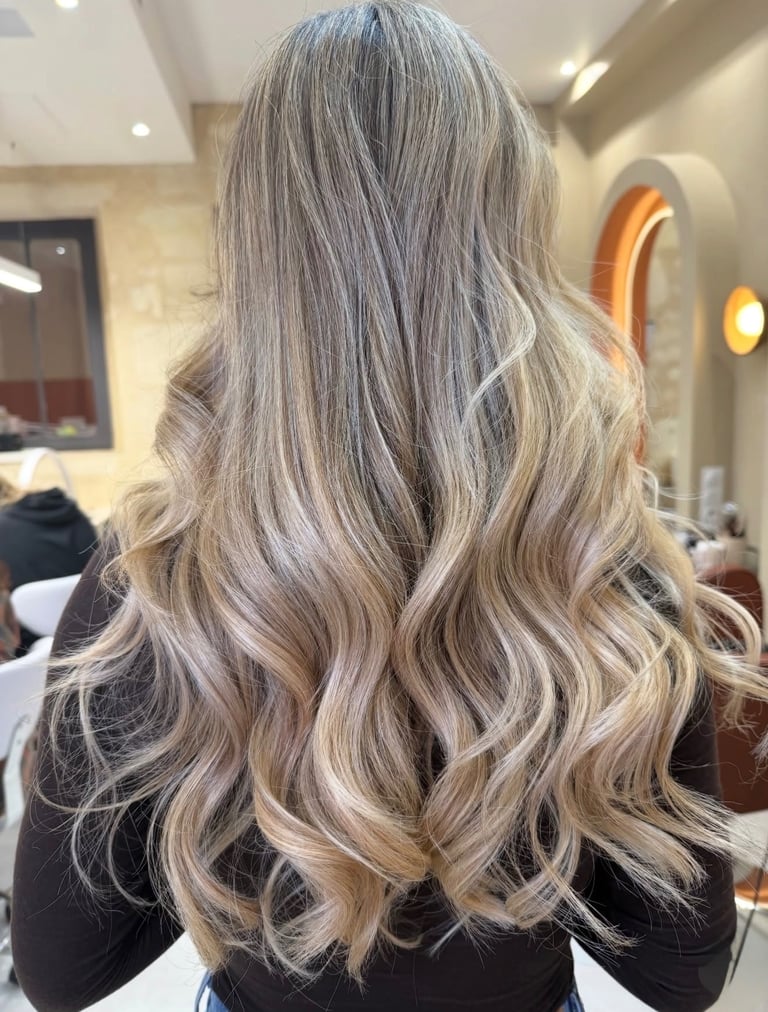Balayage, patine, shampooing, coupe et brushing — une approche globale pour un résultat raffiné.